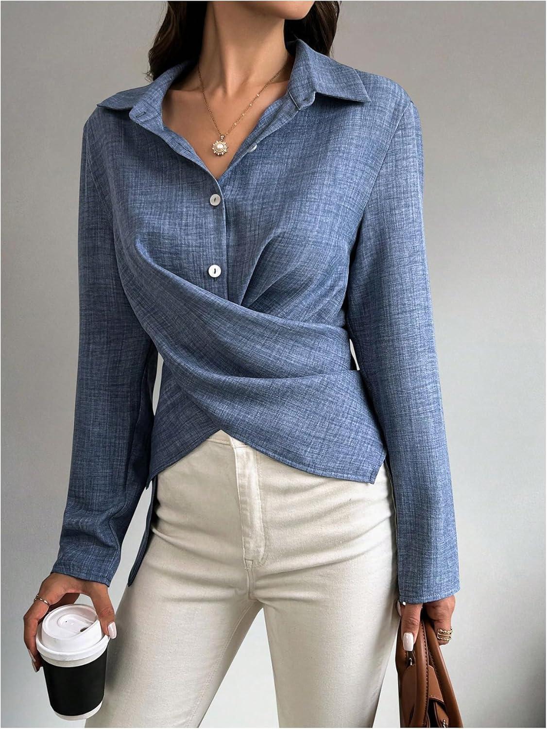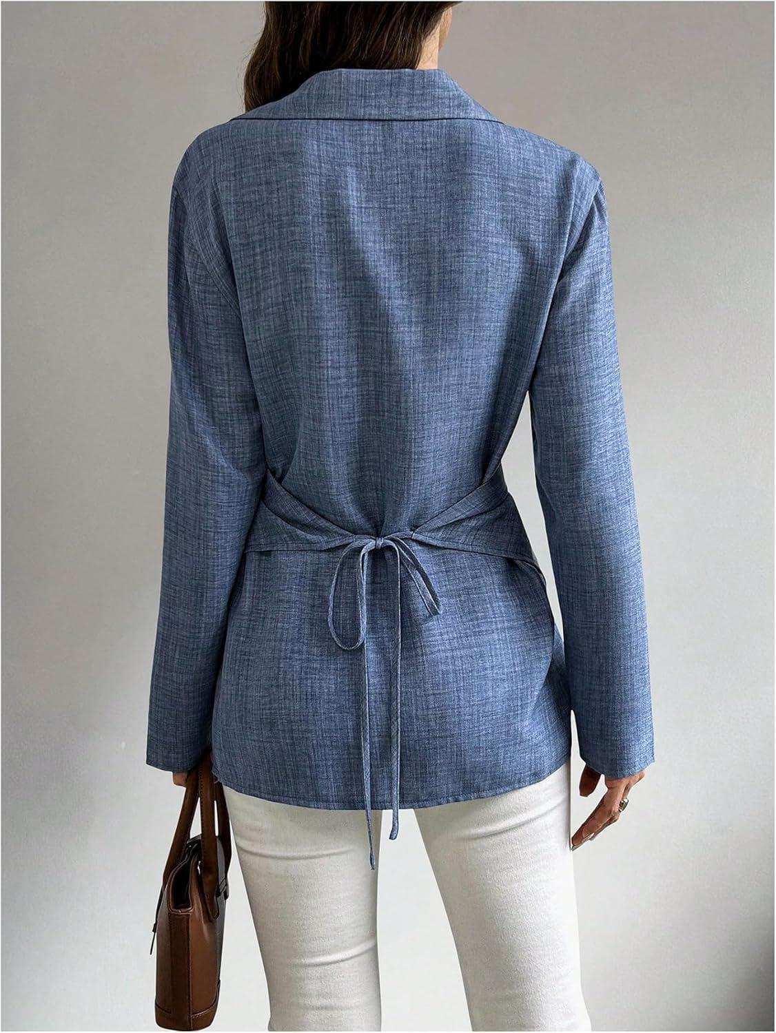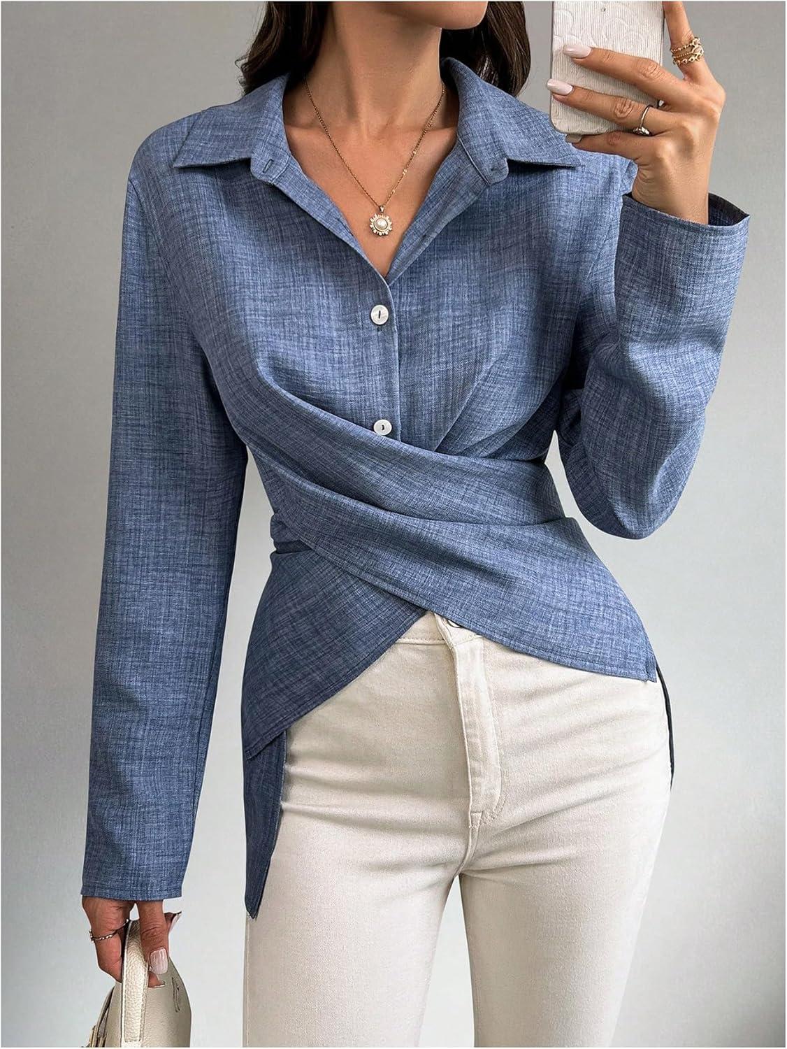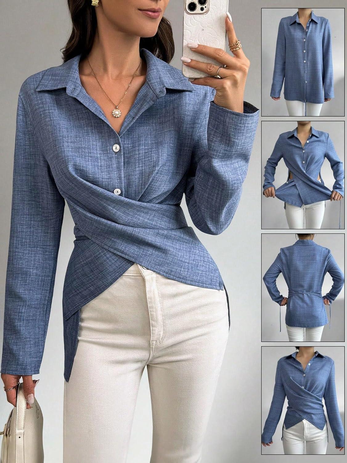 OYOANGLE Women’s Wrap Front Button Down Blouses Collared Long Sleeve Tie Back Office Work Shirts Tops(Blue)