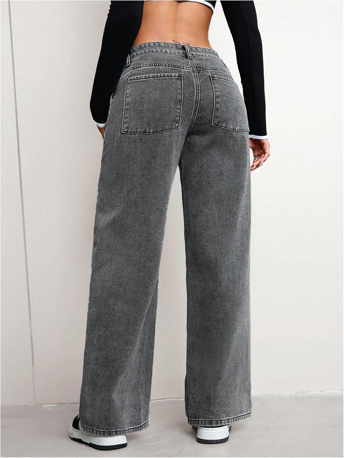 OYOANGLE Women’s Zipper Fly Wide Leg Jeans Y2k Baggy Casual Denim Pants with Pockets(Grey)