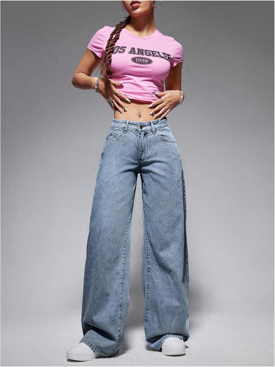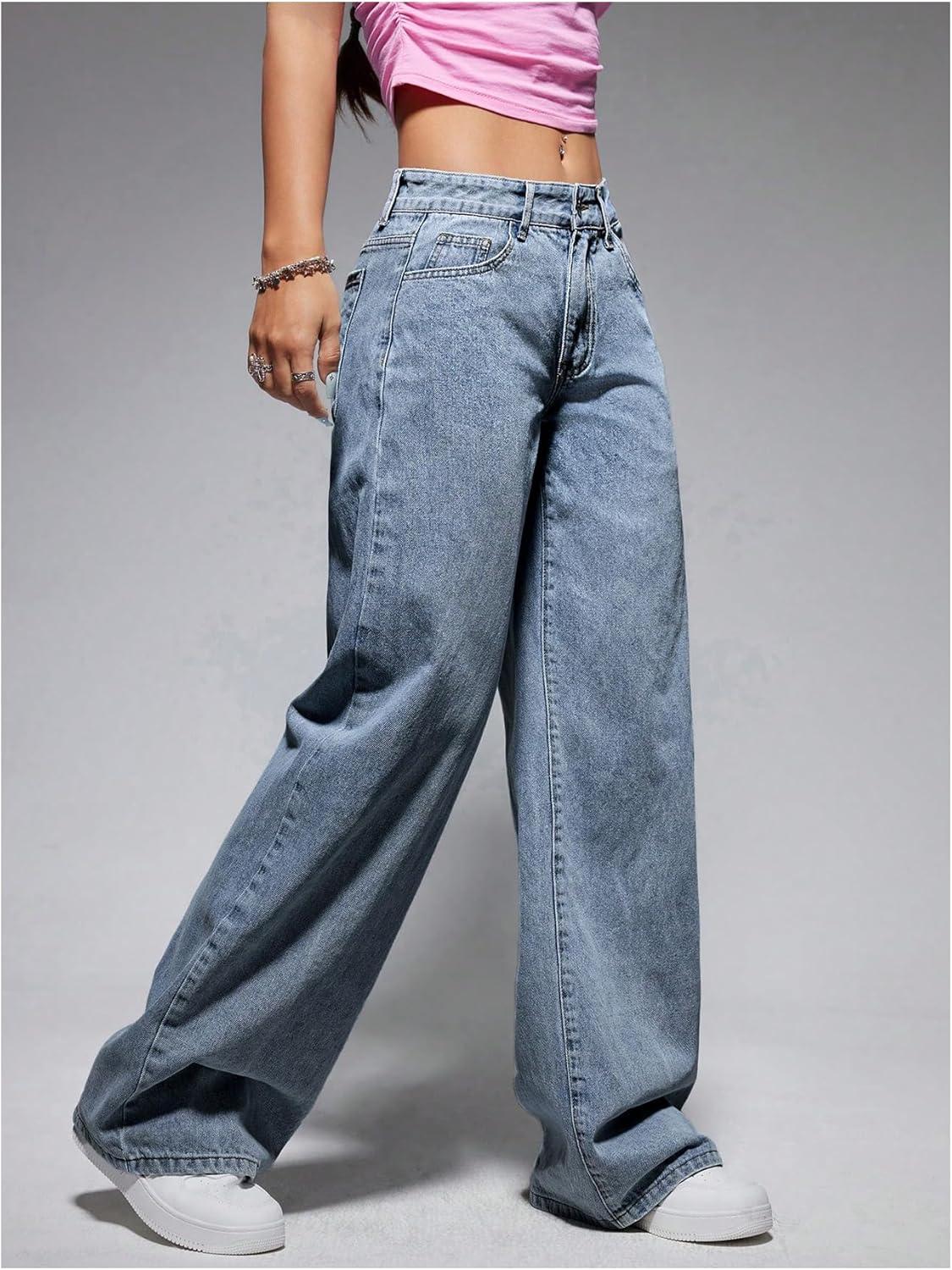 OYOANGLE Women’s Zipper Fly Wide Leg Jeans Y2k Baggy Casual Denim Pants with Pockets(Light Wash)