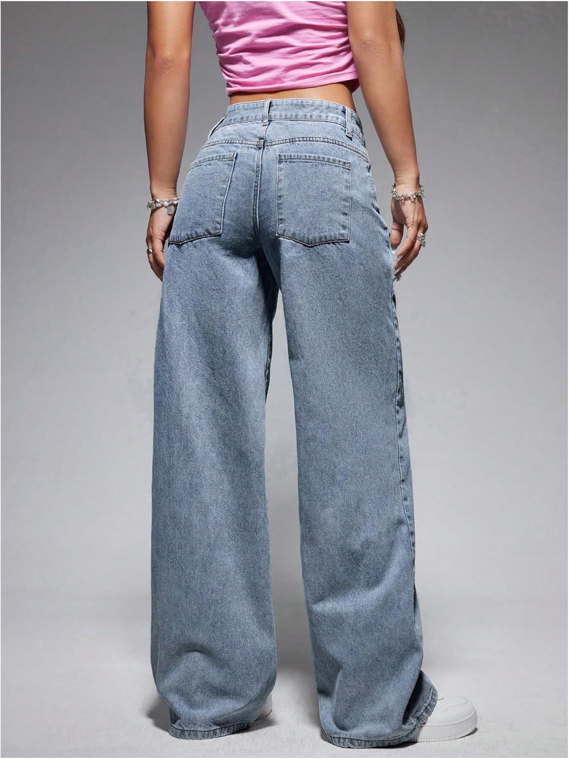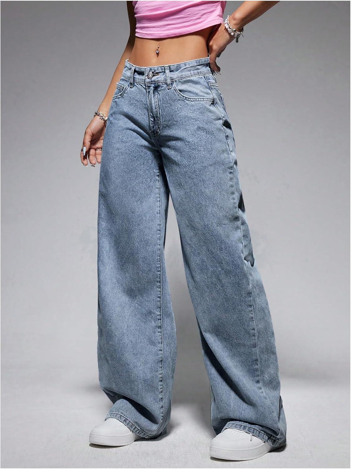 OYOANGLE Women’s Zipper Fly Wide Leg Jeans Y2k Baggy Casual Denim Pants with Pockets(Medium Wash)